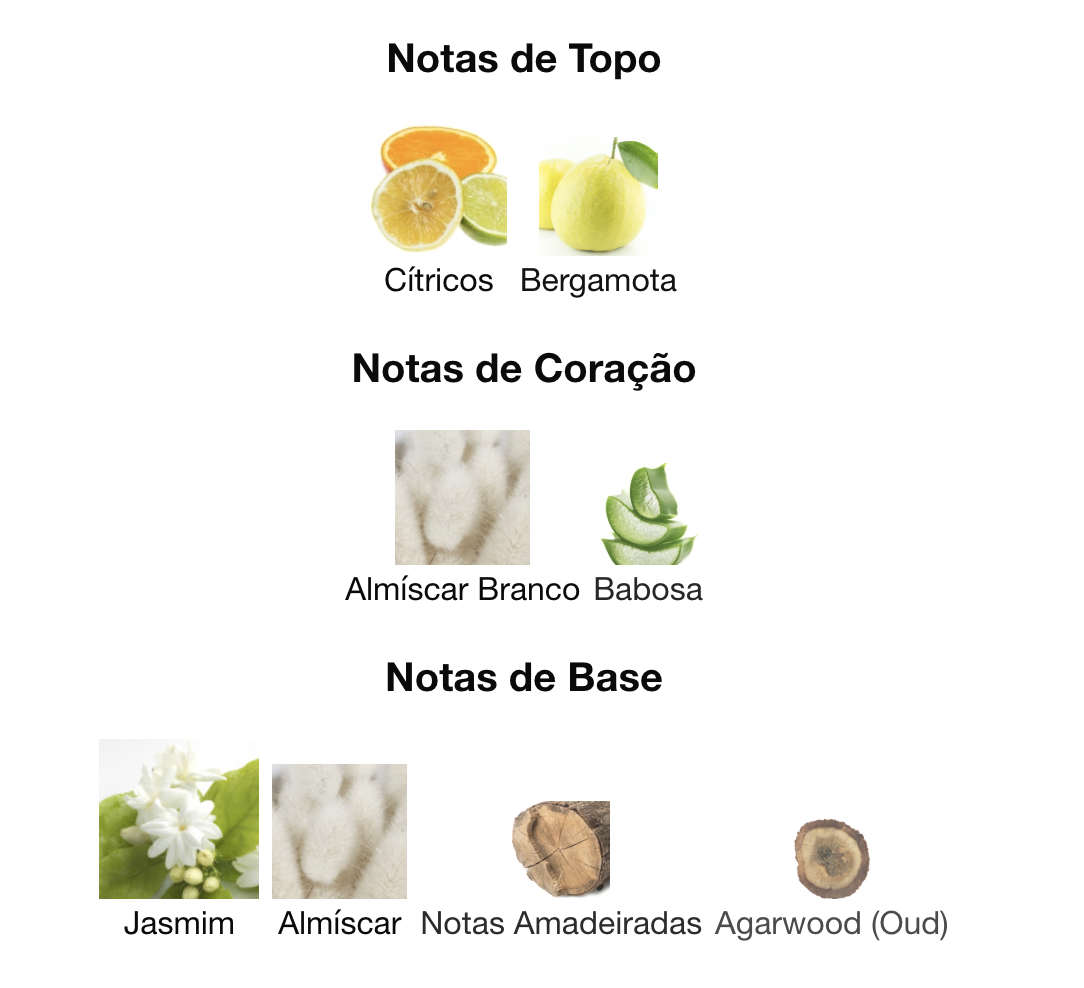 Principais Acordes Aromáticos: Cítrico, Floral Branco, Almíscarado, Amadeirado, Fresco, Atalcado.