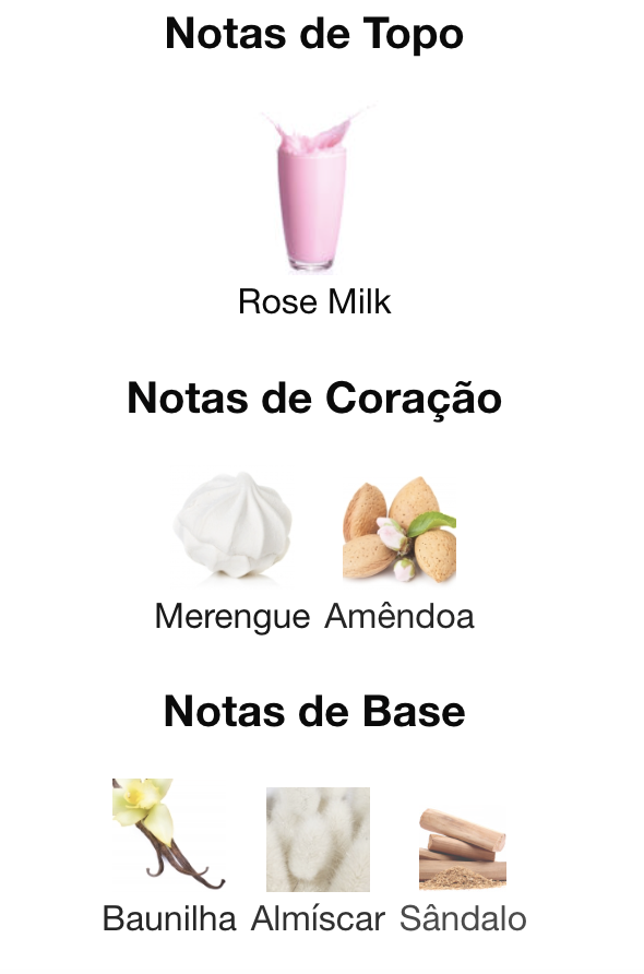 Principais Acordes Aromáticos: Floral, Gourmand, Cremoso, Doce, Amadeirado, Polvilhado, Almiscarado
