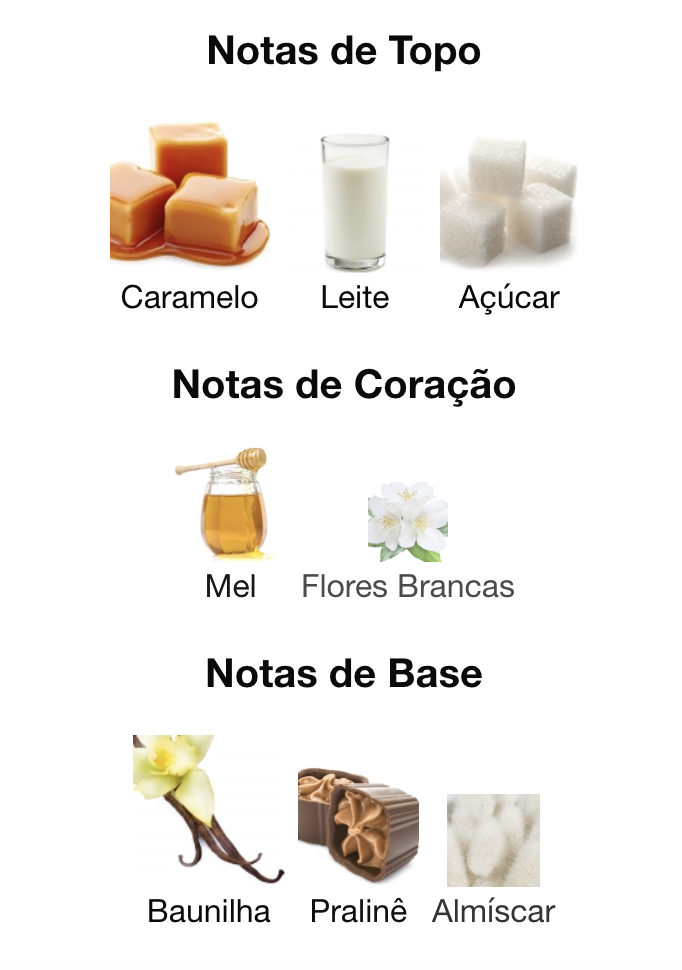 Chocolate Branco, Leite, Caramelo, Baunilha, Almiscar