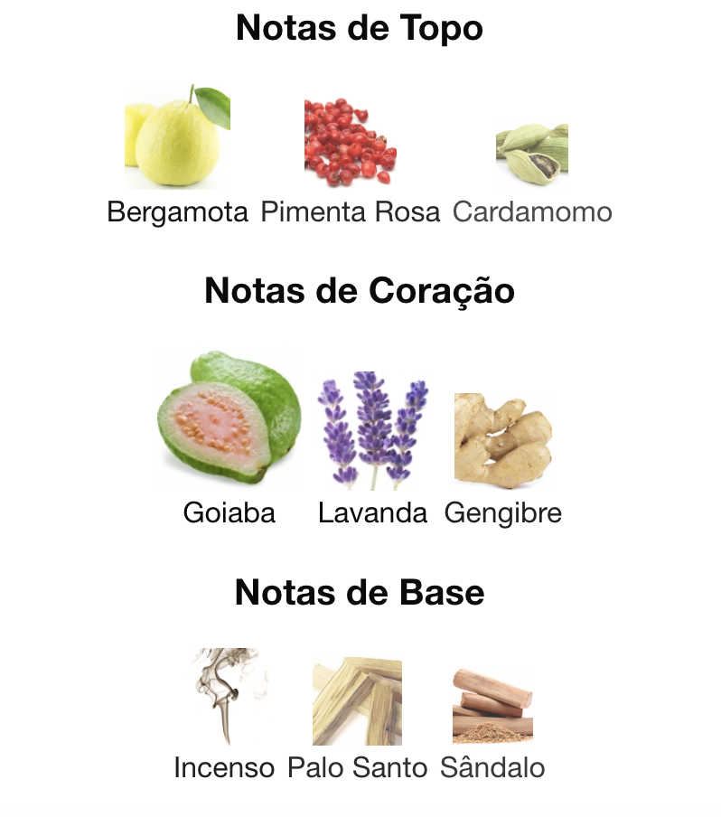 Principais Acordes Aromáticos: Amadeirado, Fresco Especiado, Cítrico, Aromático, Frutado (Goiaba), Incensado.
