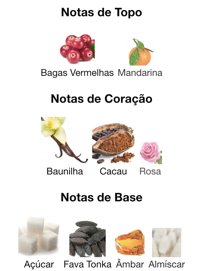 Principais Acordes Aromáticos: Gourmand, Doce, Baunilhado, Cacau, Frutado, Almiscarado, Âmbar